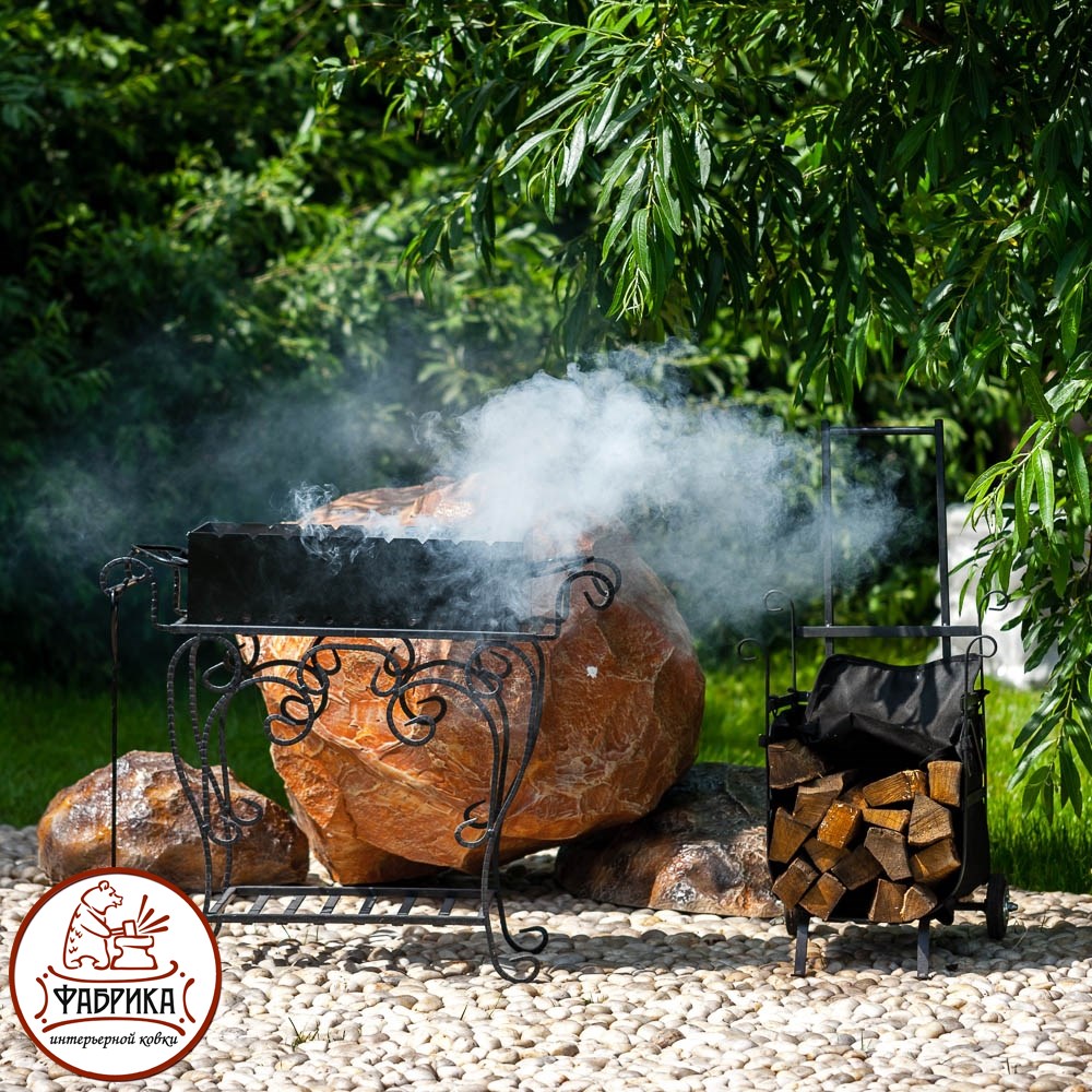 Кованый мангал 860-90 с изящными коваными ножками. А специальная подставка для дров внизу, поможет сохранить дрова в сухости. Конструкция из кованого металла украшена изящной ажурной ковкой.