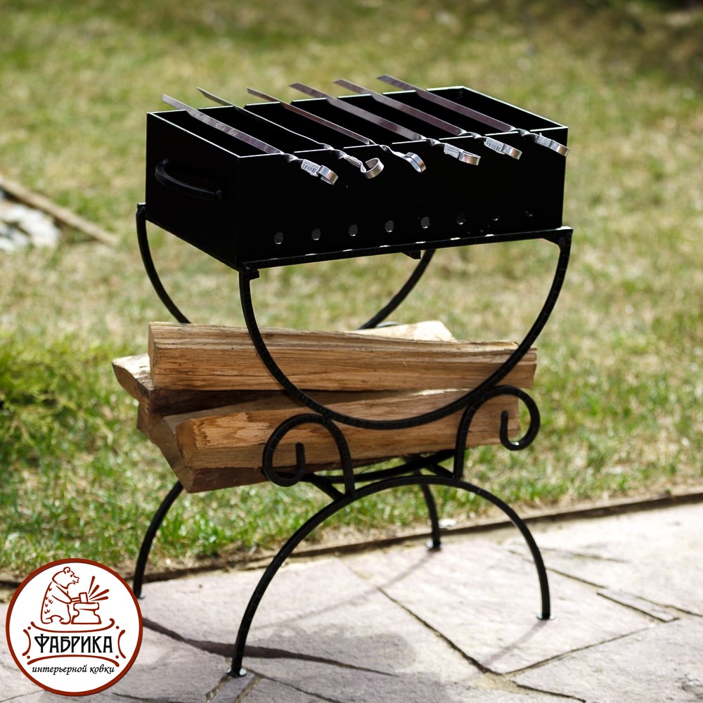 Кованый мангал 861-17 с изящными коваными ножками. А специальная подставка для дров внизу, поможет сохранить дрова в сухости. Конструкция из кованого металла украшена, изящной ажурной ковко.