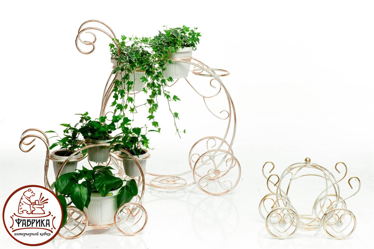 ♦ Подставка для цветов. ♦ Подходит для размещения четырех цветочных горшков. ♦ Колеса цветочницы Кареты декоративные. ♦ Материал изготовления: металл. ♦ Покраска: белый с золотом.