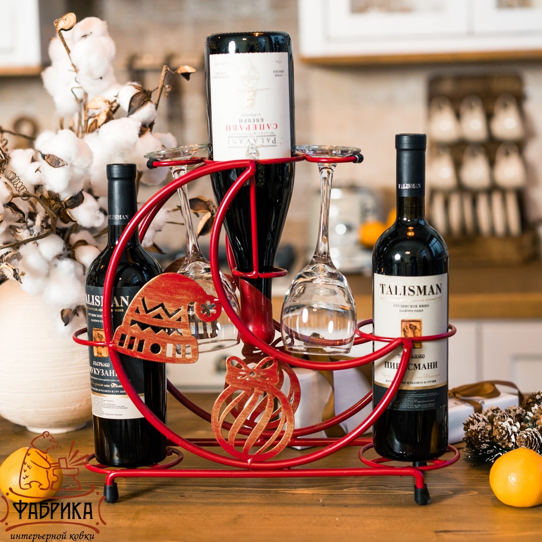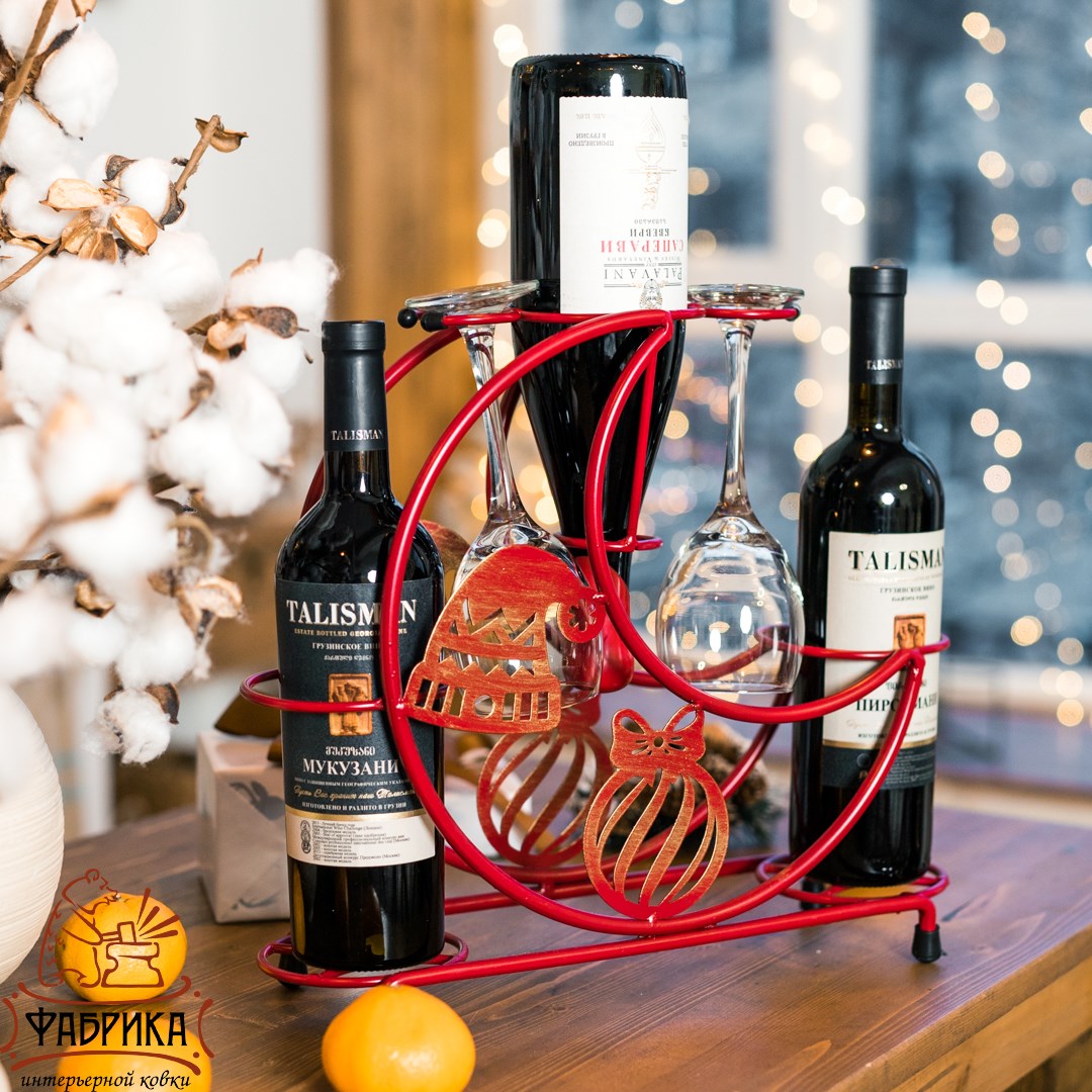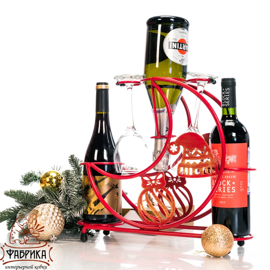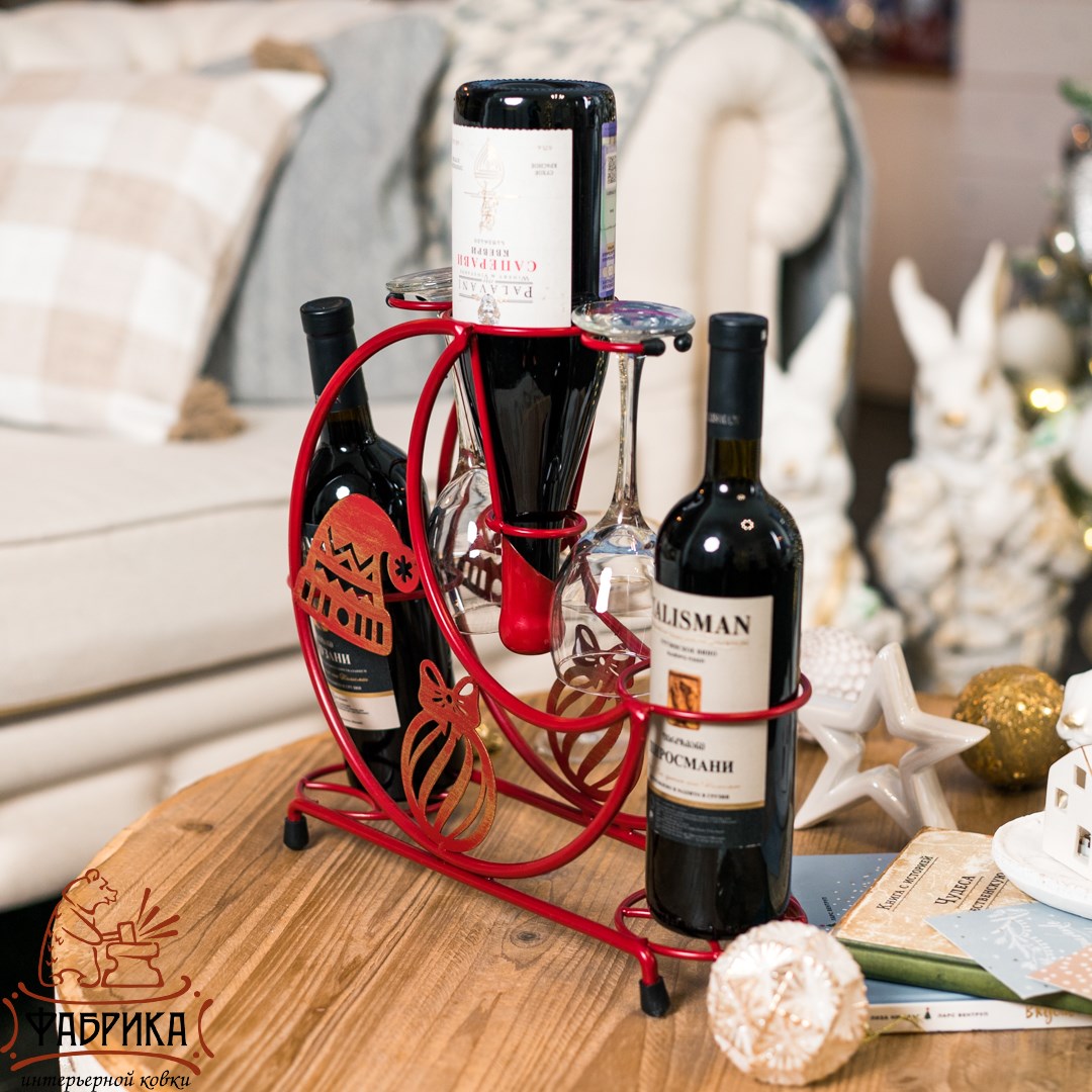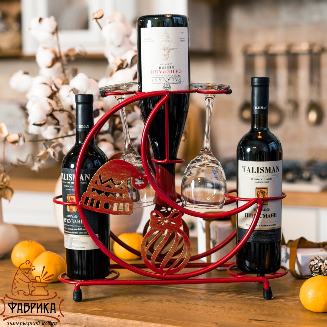Кованая подставка служит для хранения винных бутылок и бокалов, декора праздничного стола. Крепкий металлический корпус подставки позволяет вместить сразу три бутылки с напитками и два бокала.