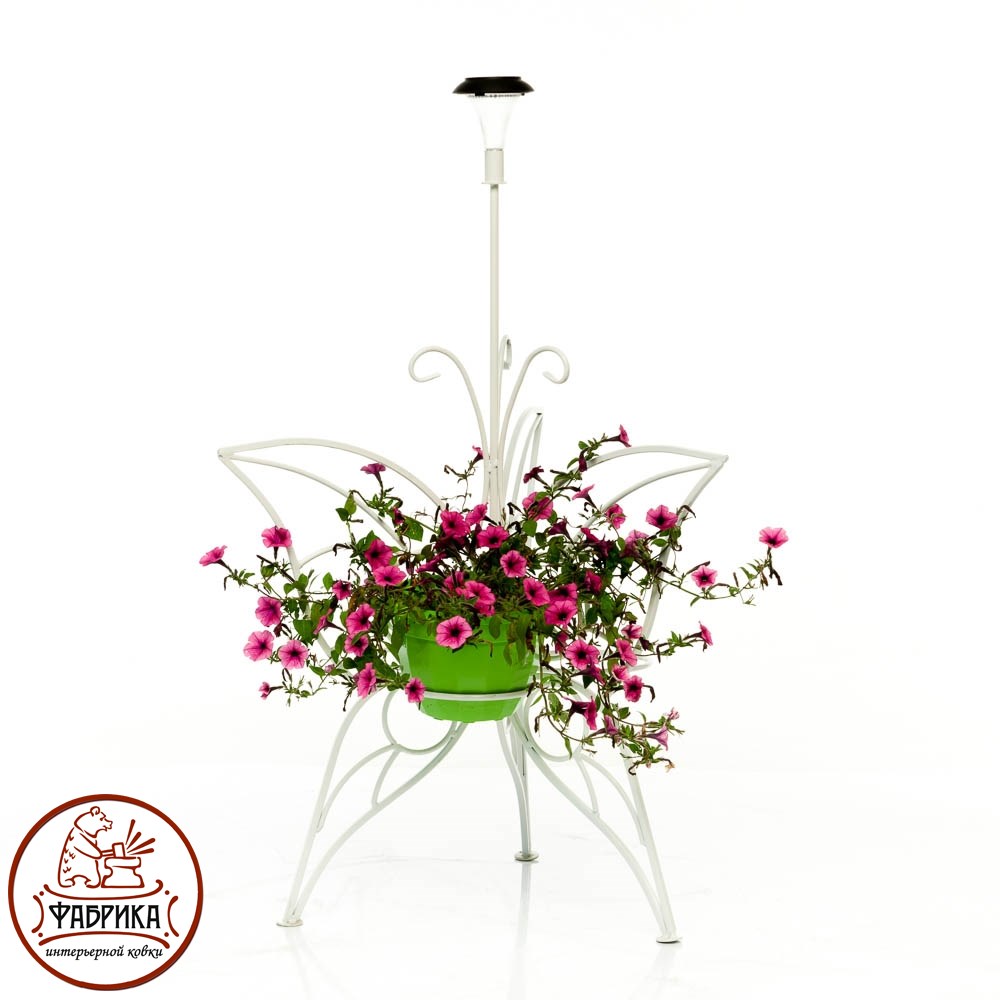 Цветочница садовая в виде бабочки. В металлическое кашпо размещают горшечные растения. Устанавливать лучше садовую подставку на ровной поверхности для прочного удержания всей конструкции. В комплект входит светодиодный фонарик.